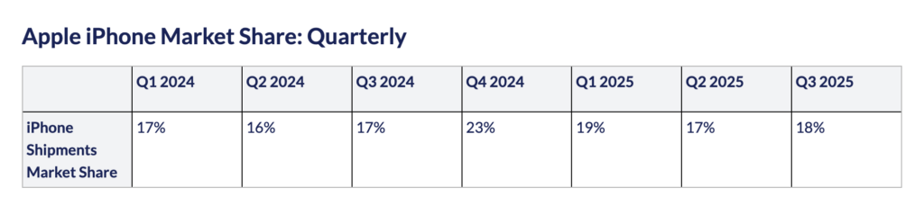 Apple iPhone市場シェア・四半期別 (2024年第1四半期〜2025年第3四半期)