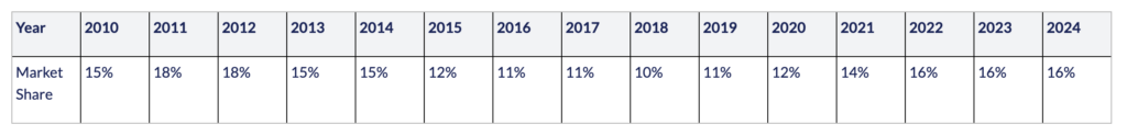 Apple iPhone 出荷シェア率・2010年〜2024年