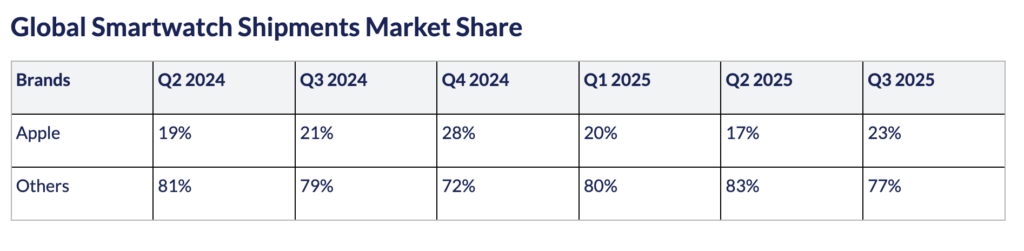 - スマートウォッチのグローバル市場における出荷は、2025年第3四半期に前年比9%増となりました。Appleが市場シェア23%で出荷をリードし、続いてHuaweiが17%となりました。