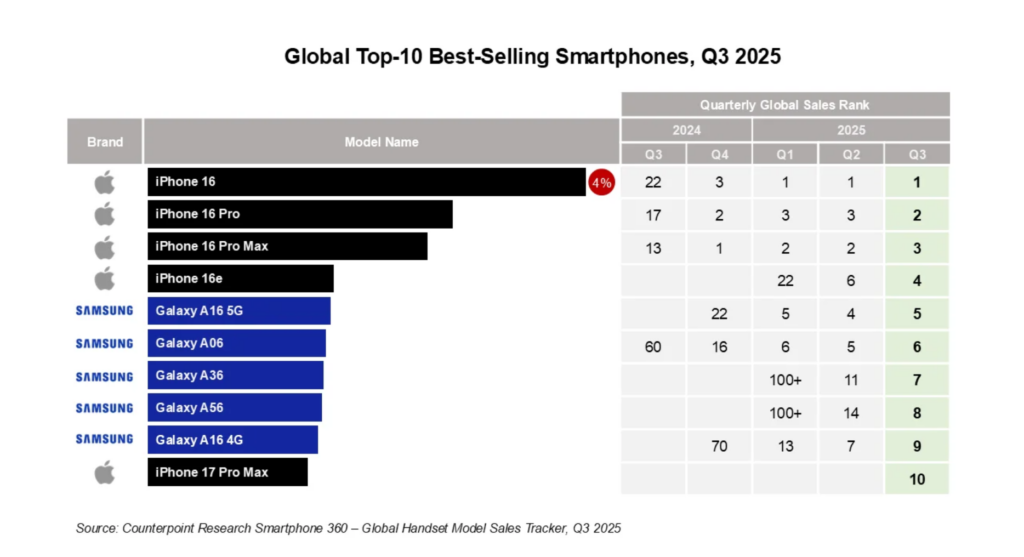 - AppleとSamsungは、2025年第3四半期のグローバル市場においてトップ10ベストセラー・スマートフォンのリストにそれぞれ5機種ずつをランクインさせました。iPhone 16は、インドおよび日本での販売増を背景に、シェア4%で首位となりました。
