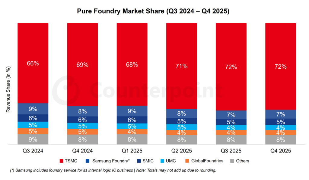 - TSMCは専業ファウンドリ市場の72%を獲得しました。これは、3nmの立ち上げの加速、AI GPU需要による4/5nmの高稼働、ならびにCoWoS能力の拡張に支えられています。