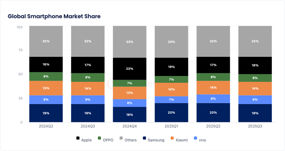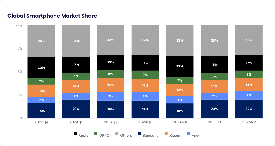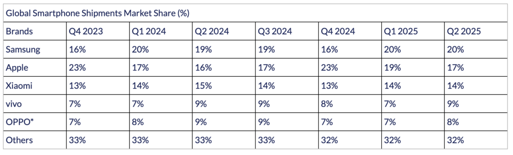 - Samsungが20%のシェアで市場をリードし、Appleが19%で僅差で続きました。Galaxy S25シリーズとiPhone 16eの発売は、両ブランドに勢いをもたらしました。