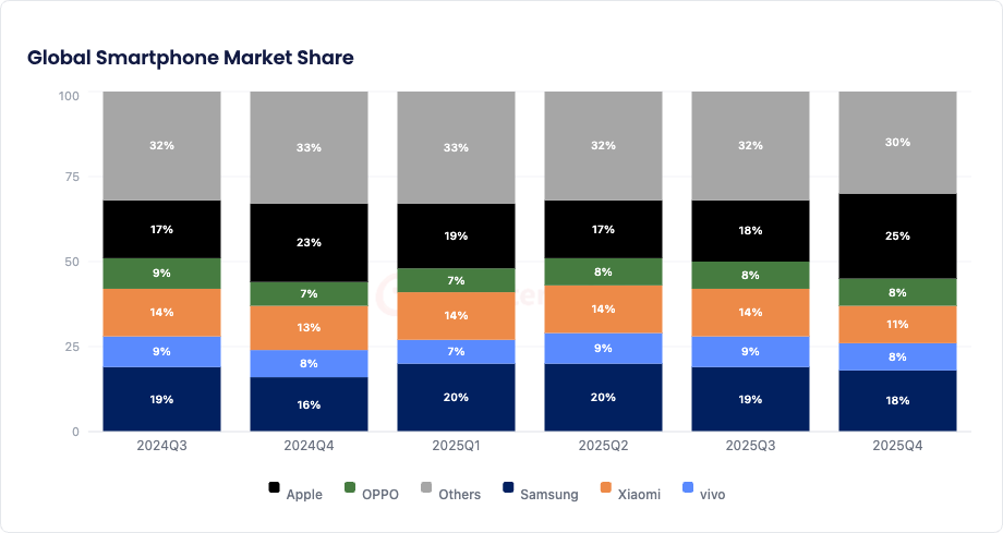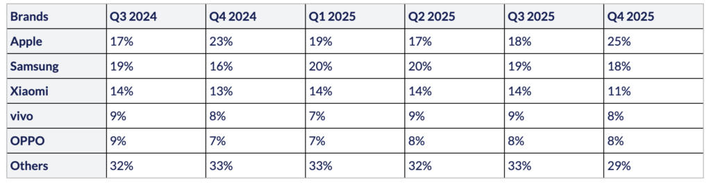 - Appleは2025年第4四半期に市場首位となり、前年比14%増を記録しました。iPhone 17シリーズへの強い需要に加え、主要先進国市場での年末商戦の勢いが追い風となりました。さらに、大規模な買い替えサイクル、主要市場での積極的な販促施策、そして高い製品価値提案も成長を支えました。