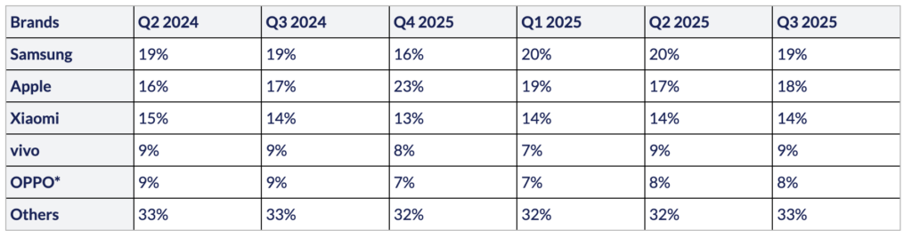 - Xiaomiは出荷シェア14%、前年比2%増で3位を維持した。同ブランドは、通信事業者との提携、販促施策、そしてオフライン・オンライン両チャネルの強化を背景に、特に低価格帯および中価格帯セグメントで東南アジア、中東・アフリカ(MEA)、中南米においてシェアを拡大しています。