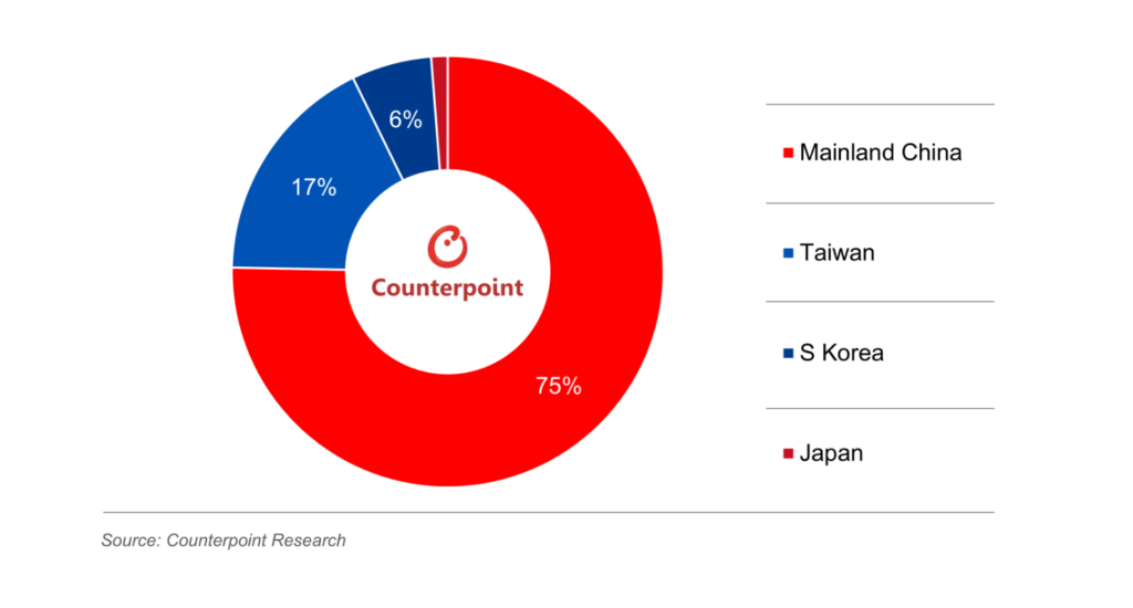 カウンターポイントリサーチ社の最新ホワイトペーパー「The Display Glass Industry Part 1」によると、ディスプレイガラス基板のグローバル市場は、中国本土がますます支配する状況となっており、2025年の現在、総需要の75%を中国市場が占めています。大型スクリーン向けのフラットパネルディスプレイ(FPD)生産能力に対する中国市場における巨額投資と、韓国および日本における工場閉鎖により、中国市場が前例のない優位性を確立しました。
