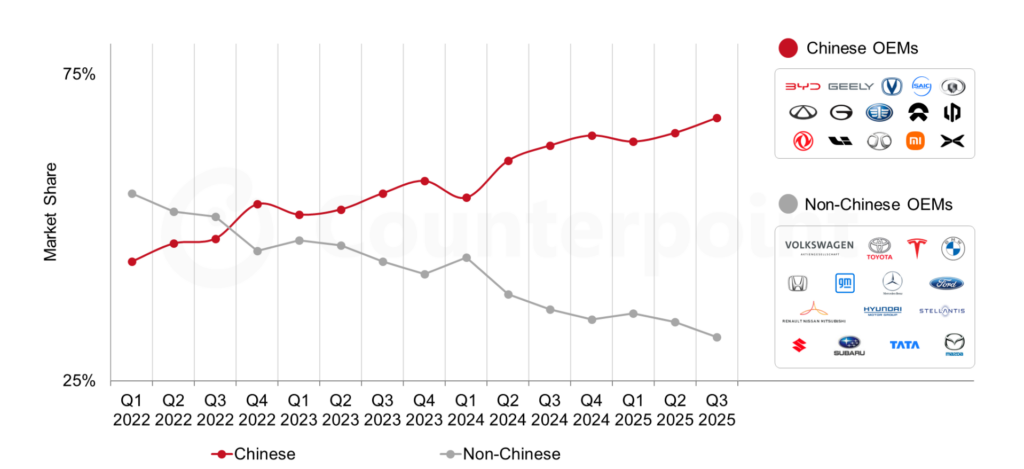 出典: カウンターポイントリサーチ社Global Connected Car Tracker, Q3 2025.
