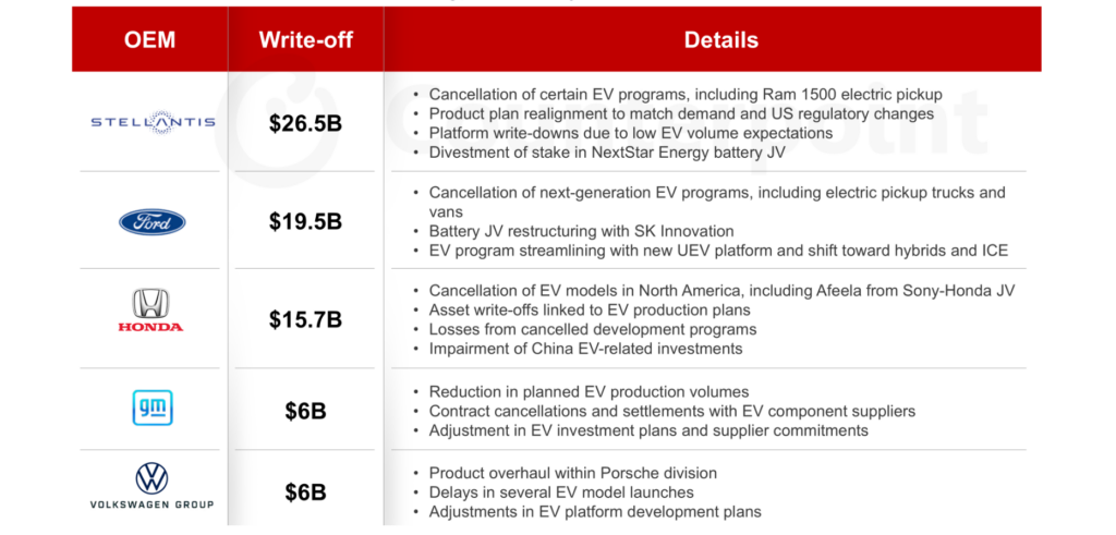 Ford、General Motors、Honda、Porsche、Maserati、Stellantisなどの企業は、EV関連で合計700億ドルを超える評価損や損失を計上しています。その結果、複数のOEMが電動化計画の縮小や延期に動いており、Volvo Carsのように長期EV目標を見直している企業もあります。