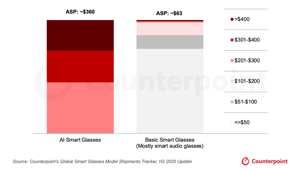 2025年下期には、AIスマートグラスのグローバル小売平均販売価格(ASP)が、2025年上期の約347ドルから約360ドルへ上昇しました。この上昇は主に、市場出荷の大半を占めるMetaの新製品で実施された価格引き上げによってもたらされました。これに対し、ベーシックスマートグラスのASPは約63ドルまで大きく低下しました。この下落は主に、HuaweiやAmazonといったプレミアムなスマートオーディオOEMからの出荷が減少したことによるものです。2025年下期には、スマートオーディオグラスの出荷の多くが50ドル未満のエントリーセグメントに集中し、OHO Sunshineやその他の小規模ブランド、ホワイトラベルブランドがこの価格帯を牽引しました。
