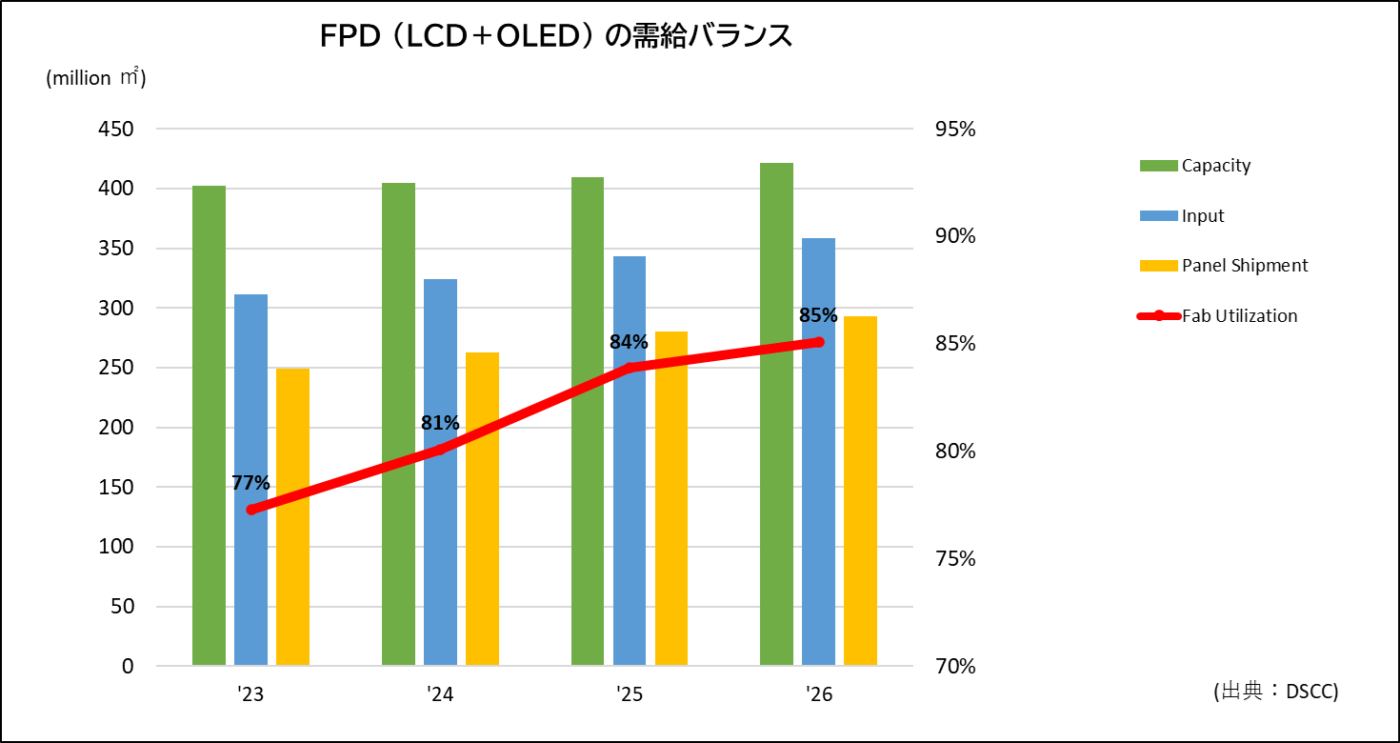 Counterpoint Research FPD部門 (旧DSCC) では、2025年のFPD需要面積 (液晶+有機EL) の伸び率を前年比6%増、生産能力の増加率を同1.2%増と予測している。引き続き能力増強のペースが小幅にとどまることから、パネル工場の平均稼働率は2024年よりも上昇する見通しだ。