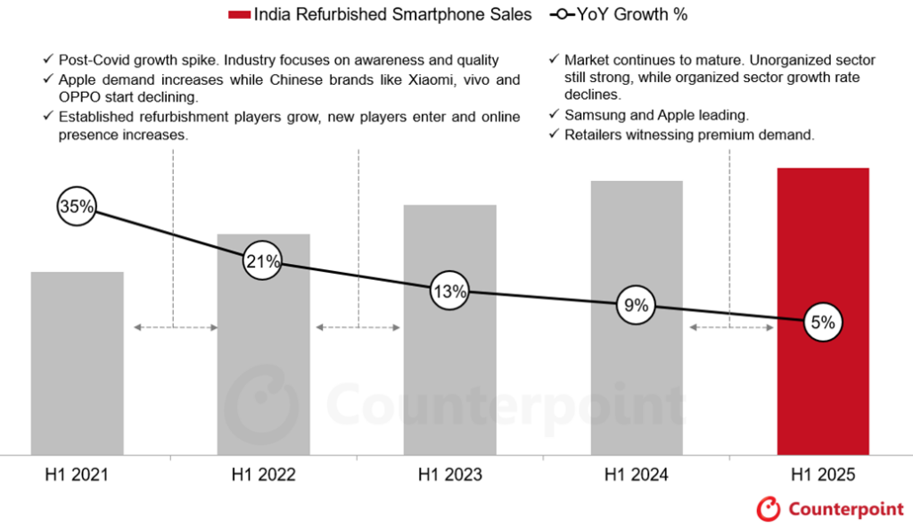 India Refurbished Smartphone Sales with Growth Rate, H1 2021 to H1 2025